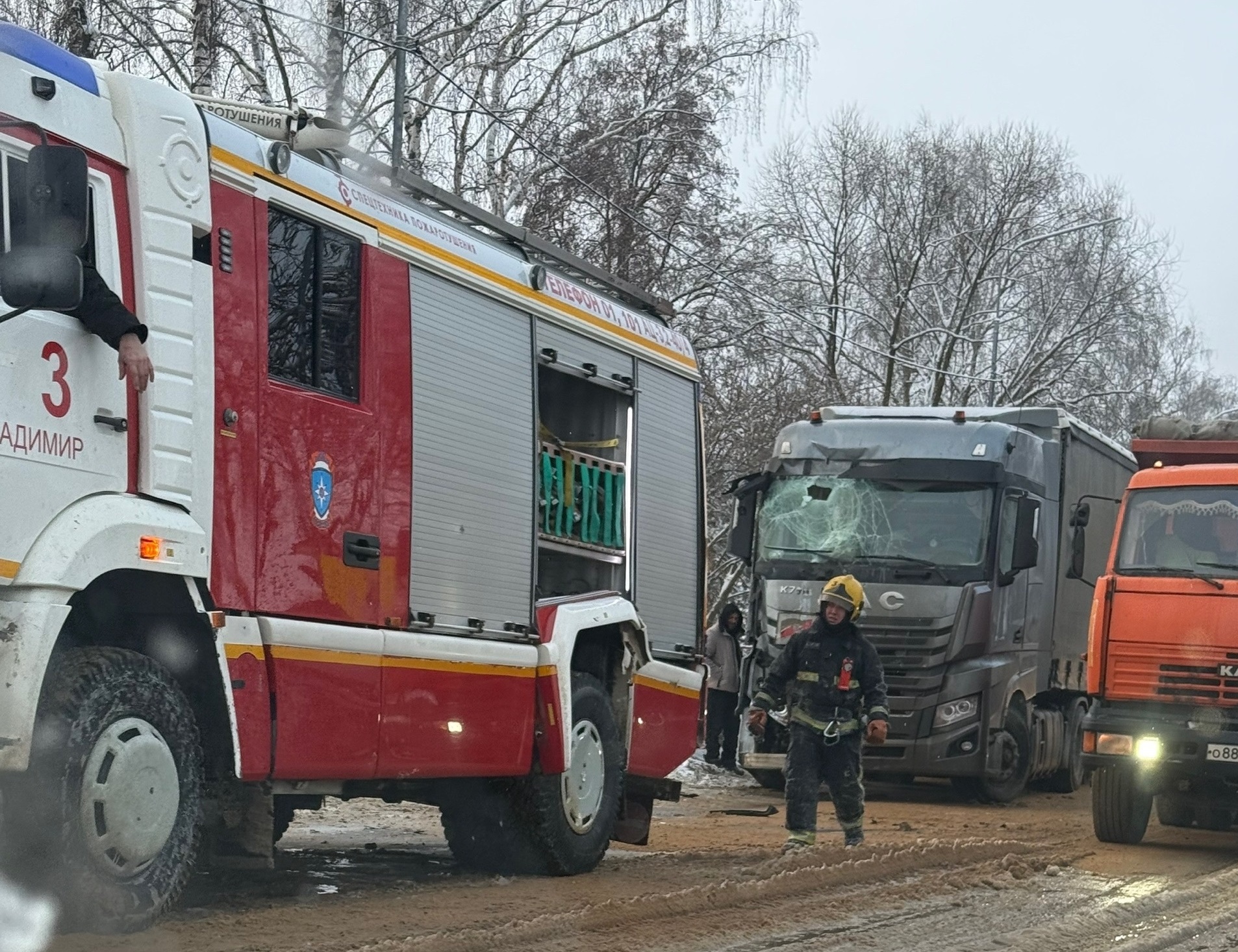В Боголюбово фура столкнулась с припаркованной пожарной машиной во время возгорания жилого дома