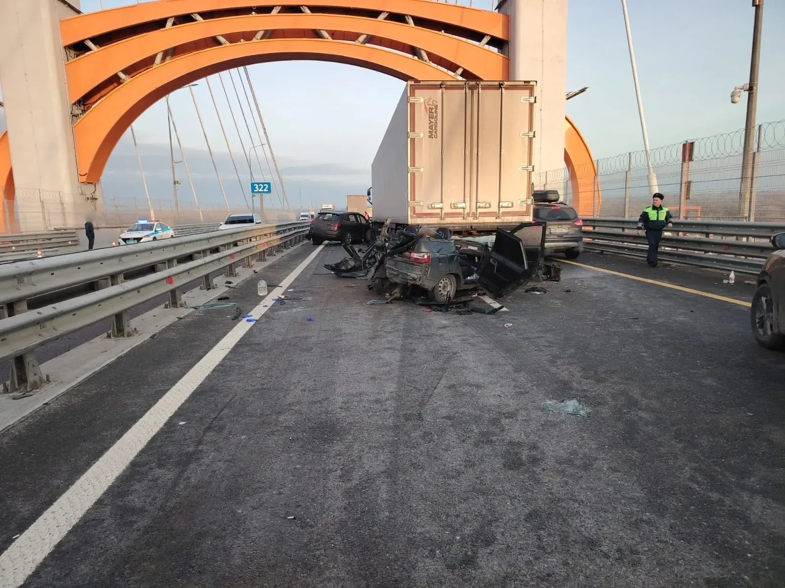 В результате столкновения пассажир автомобиля «Ауди» получил травмы. Ему потребовалась помощь медиков. Около 5.45 в стоящую фуру въехал «ВАЗ». Водитель машины и его пассажир госпитализированы. Около 6.10 произошло еще одно столкновение - автомобилей «КАМАЗ» и «Вольво». Медпомощь понадобилась водителю «Вольво». Движение на этом участке пути было приостановлено с 6.10, в 7.40 пущено по одной полосе, и полностью восстановлено в 8.20.