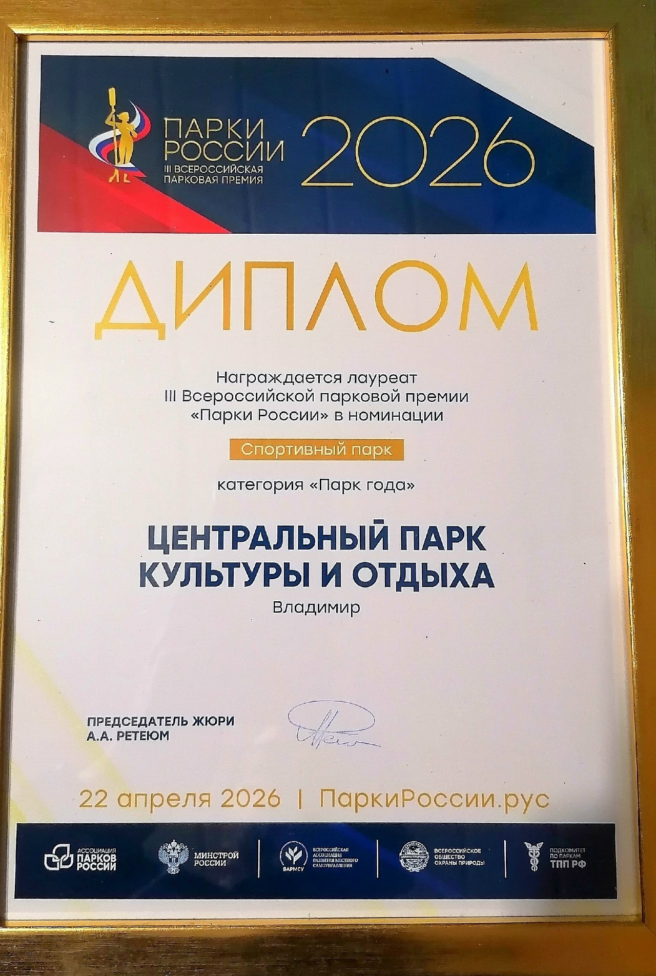 За звание лучшего паркового сообщества боролись 459 муниципальных образований из 89 субъектов Российской Федерации и центральный парк Владимира вошел в число финалистов, получив высочайшую оценку за развитие инфраструктуры и проведение мероприятий, направленных на пропаганду здорового образа жизни. Церемония награждения победителей и лауреатов премии прошла в Москве.