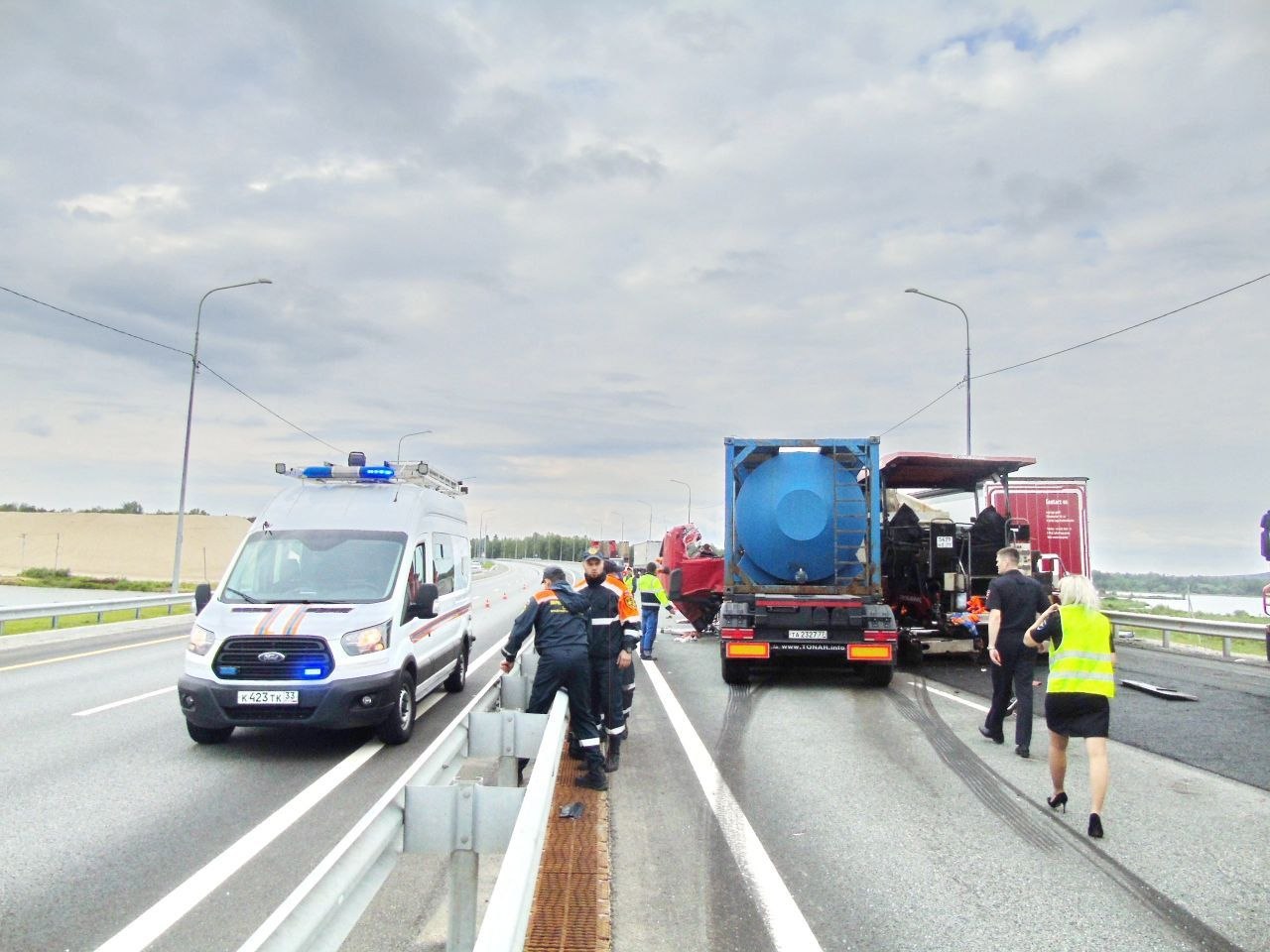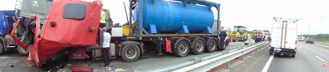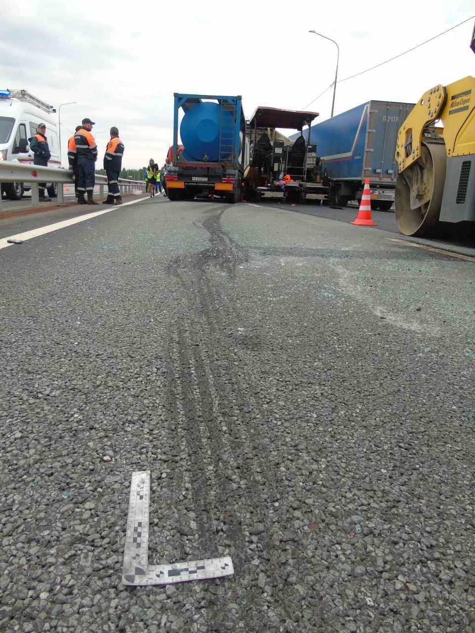 В это время по левой полосе дороги в сторону Москвы двигался автомобиль «КАМАЗ», который передней правой частью совершил столкновение с катком, вследствие чего водитель грузовика потерял контроль над управлением и совершил наезд на стоявший в правой полосе движения асфальтоукладчик.
