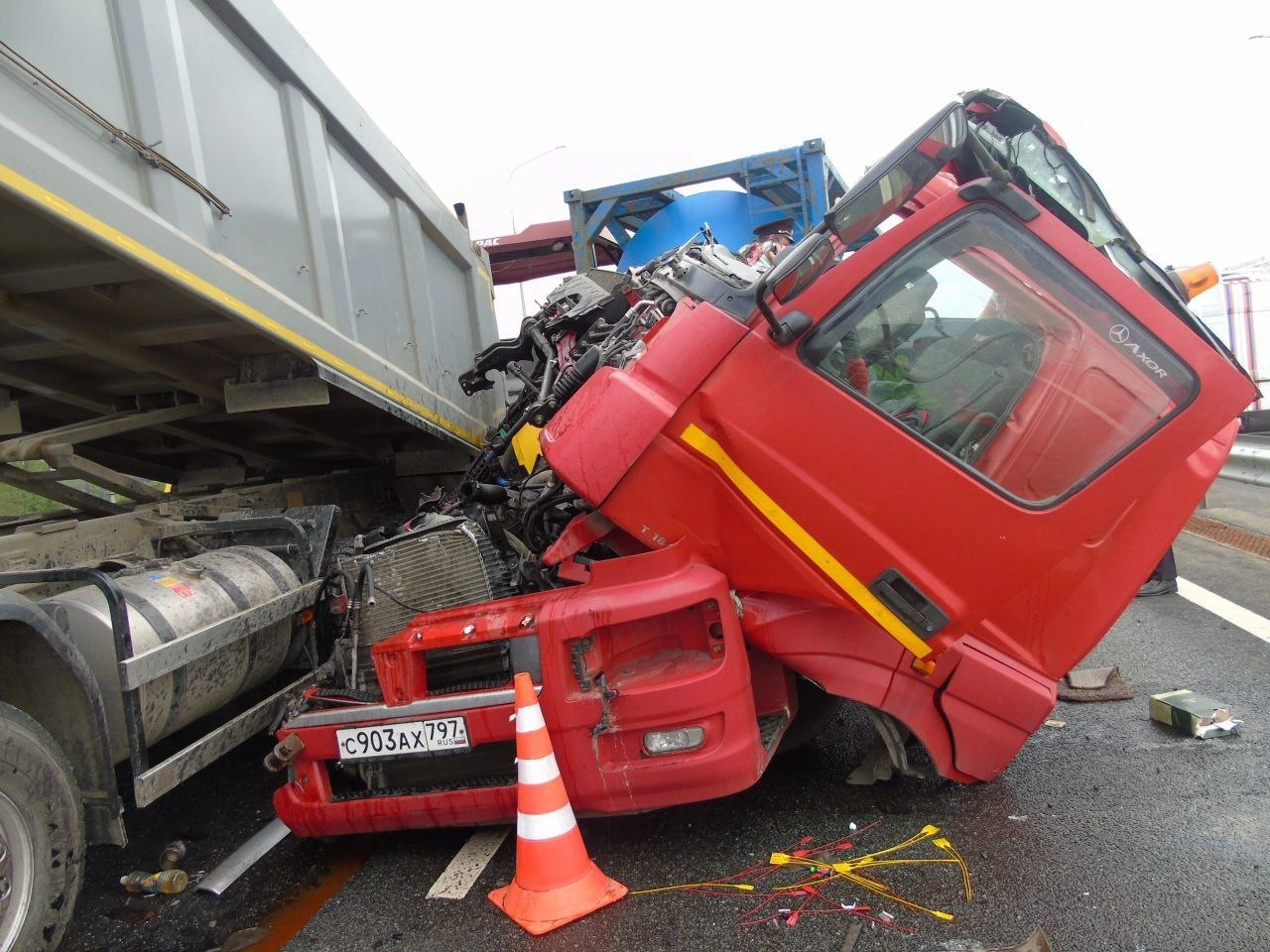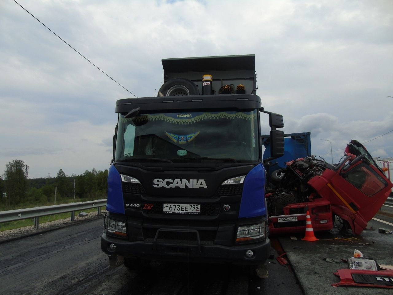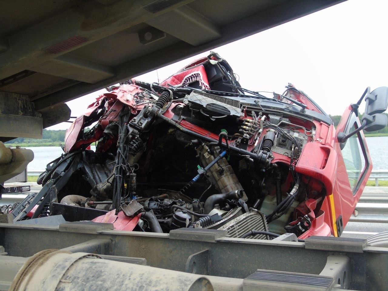 В это время по левой полосе дороги в сторону Москвы двигался автомобиль «КАМАЗ», который передней правой частью совершил столкновение с катком, вследствие чего водитель грузовика потерял контроль над управлением и совершил наезд на стоявший в правой полосе движения асфальтоукладчик.